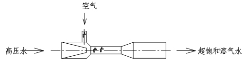 本溶氣系統(tǒng)采用射流吸氣原理,在工作壓力0.3-0.5Mpa左右,通過噴口、混合管中水流的高速運(yùn)動(dòng),使大量的空氣在短時(shí)間內(nèi)被吸入,并在混合管中被高速切割成微氣泡,然后較大限度地溶入水中,形成超飽和的溶氣水。并通過后續(xù)的減壓釋放出大量地直徑在5-10um的微氣泡,與水中的絮體相結(jié)合,形成穩(wěn)定的夾氣絮體,一起上浮至水面,完成絮浮物的分離。
