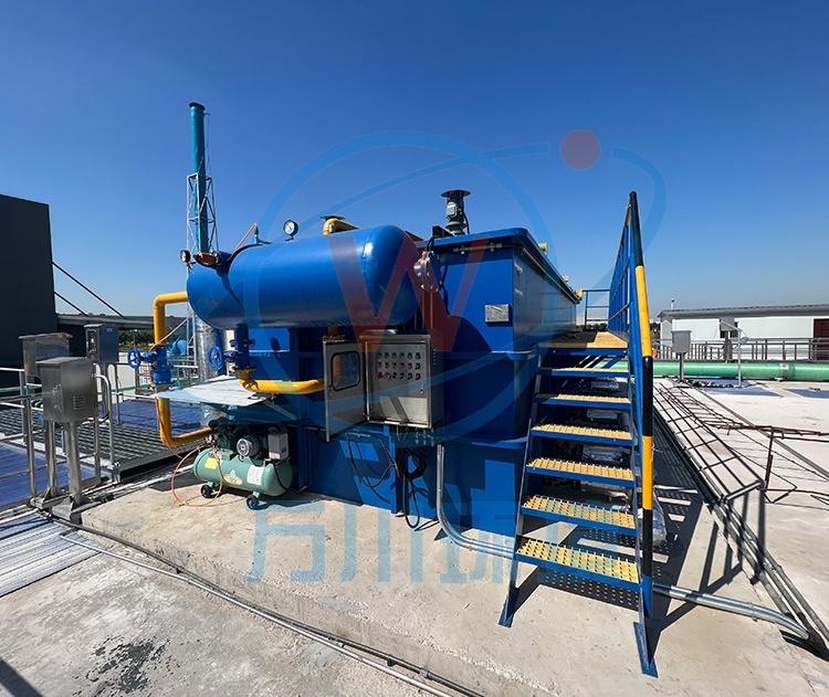 WF型組合氣浮設備是由氣浮池體、溶氣系統、溶氣水回流管路、溶氣水釋放裝置、刮渣機和電控系統組成。