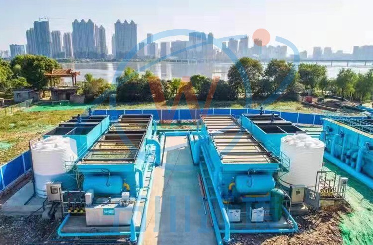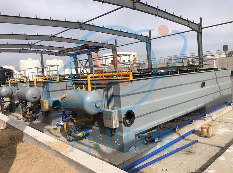 氣浮主要起固液分離作用(同時可以降低COD、BOD、色度等)。在原水中加入混凝劑和絮凝劑,經過有效絮凝反應時間后,原水進入組合氣浮接觸區。在接觸區內,溶氣水中的微氣泡與原水中絮體相互粘合,一起進入分離區,在氣泡浮力作用下,絮體與氣泡一起上升至液面,形成浮渣。浮渣由刮渣機掛至污泥區。下層的清水通過集水管自流至清水池。其中一部分清水回流,供溶氣系統使用,另一部分則排放。